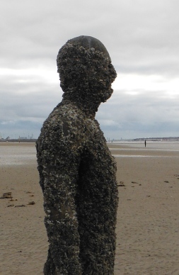 These statues are made of cast iron and are a lifesize model made from a mould of Antony Gormley himself. Antony Gormley is the artist who designed the "Angel of the North" statue.
