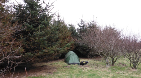 It turned out this was ideal, a sheltered site with level ground and short grass. The tent was up by 18.45.